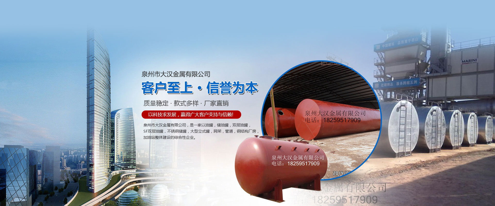 泉州市大漢金屬有限公司,是一家以油罐、儲油罐、雙層油罐、SF雙層油罐、不銹鋼儲罐、大型立式罐、網架、管道、鋼結構廠房、加油站整體建設的綜合性企業(yè)。本公司以技術人員、施工經驗豐富的工程隊、自動化設備、擁有鋼結構建筑、螺栓球網架設計安裝技術力量,嚴格按照國家容器標準制造,是一家產品開發(fā)并生產各種壓力容器和制造金屬結構工程,化工石油工程安裝的大型企業(yè)。近多年來,以質量穩(wěn)定、客戶至上、信譽為本,以科技求發(fā)展,贏得廣大客戶支持與信賴。